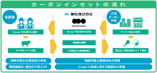 当社とdsm-firmenichが連携して、Bovaer(R)を資材として生産者様にご提供することに留まらず、メタンガス削減実績を環境価値化すると共に、生産された畜産品と環境価値とセットでトレースしながら川下企業様にお届けすることで、カーボンインセット※1を実現し川下企業様のスコープ3の削減にも寄与することを目指します。それにより、気候変動対応の更なる推進と、サプライチェーンパートナーとの関係強化に繋げ、より持続可能なサプライチェーンの協創を目指していきます。