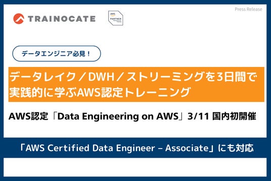 トレノケート株式会社(本社:東京都新宿区、代表取締役社長:早津 昌夫)は、アマゾン ウェブ サービス(AWS)認定トレーニング「Data Engineering on AWS」を、日本語による公式トレーニングとして3月11日より国内で初めて提供開始します。本コースは、AWS上でのデータレイク、データウェアハウス(DWH)、バッチ処理、ストリーミング処理といったモダンなデータエンジニアリング基盤を、3日間で体系的かつ実践的に習得できる中級者向け公式トレーニングです。