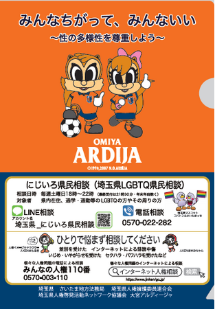 大宮アルディージャとコラボしたデザインのクリアファイル等、啓発物品を人権啓発ブース付近で配布します(先着1,000名様)。