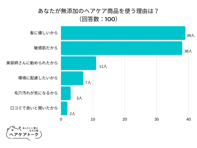 100人にアンケートを行ったところ、「髪に優しいから」と回答したのは全体の39%でした。