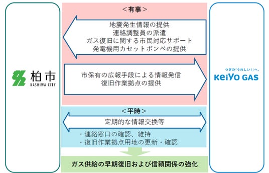 柏市は、京葉ガス株式会社と大規模地震などの災害発生時に相互に連携・協力することで、ガス供給の早期復旧に向けた活動に取り組むことを目的として、「災害時における相互連携・協力に関する協定」(以下「本協定」)を締結しました。