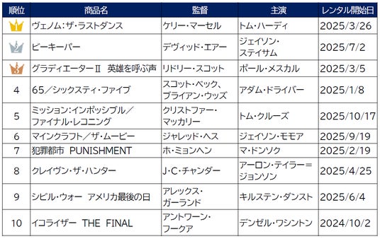 洋画編では、『ヴェノム:ザ・ラストダンス』が上半期に続き1位をキープ。2位『ビーキーパー』、5位『ミッション:インポッシブル/ファイナル・レコニング』は、下半期からのレンタル開始にもかかわらず、上位にランクインしました。