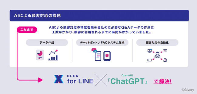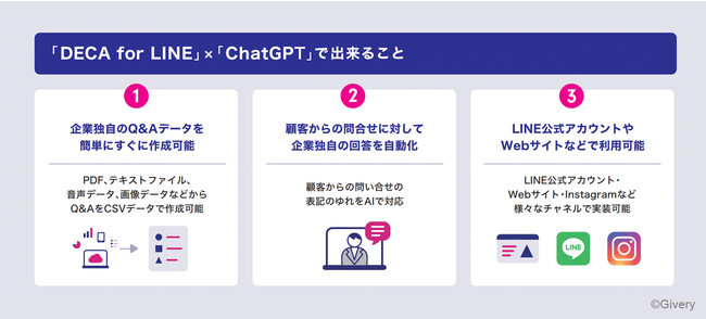 LINEマーケティングツール「DECA for LINE(デカ・フォー・ライン)」を提供する株式会社ギブリー(本社:東京都渋谷区、代表取締役社長:井手高志、以下ギブリー)は、DECA for LINEとChatGPTを連携した新機能「Q&A自動生成」をリリースしました。