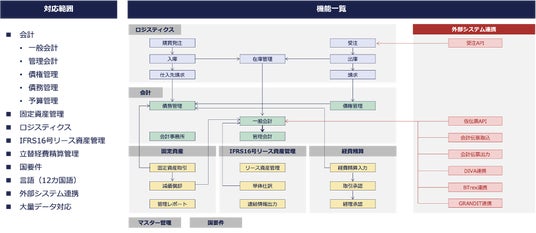 機能:会計、固定資産管理、ロジスティクス、新リース会計基準、IFRS16号リース資産管理、立替経費精算管理、各国要件、マネジメントコックピット、BPOコックピット、外部連携(連結会計、倉庫管理等)機能があり、すべて多言語で使用することが可能です。