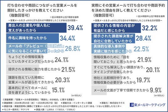 株式会社ラクス(本社所在地:東京都渋谷区、代表取締役:中村 崇則)が提供するメールマーケティングサービス「楽楽メールマーケティング」(旧名称:配配メール)は、業務にて営業メールをきっかけに打ち合わせや商談をしたことがある方とない方を対象に「営業メールの受信実態と『商談化』の分岐点」に関する調査を実施しました。