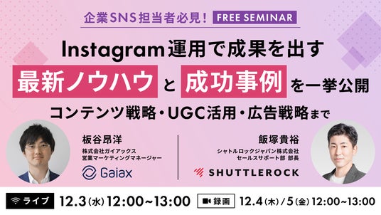 シャトルロックジャパン株式会社は12月3日(水)12:00より、株式会社ガイアックス様との共催で「Instagram 運用で成果を出す最新ノウハウと成功事例」をテーマにオンラインセミナーを開催します。