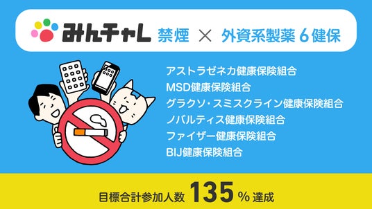 禁煙プログラム「みんチャレ禁煙」を開発・運営するエーテンラボ株式会社(本社:東京都中央区、代表取締役:長坂 剛)は、グラクソ・スミスクライン健康保険組合およびファイザー健康保険組合を含む、外資系製薬企業6健康保険組合の連絡会である戊子会(以下:戊子会)が「みんチャレ禁煙」に合同参加し、目標の合計参加人数の135%を達成したことをお知らせいたします。