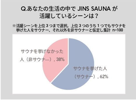 活躍シーンに「サウナ」を挙げた人をサウナーと仮定し、全ユーザーをサウナー、非サウナーで分類すると38%の人は非サウナーという結果に。「JINS SAUNA」は、非サウナーにも購入されていることが明らかになりました。それでは、非サウナーはなぜJINS SAUNAを使っているのでしょうか。非サウナーが挙げた「JINS SAUNA」の活躍シーンを見ていきましょう。