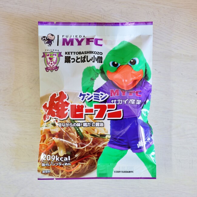 このような経緯から、藤枝MYFCとコラボし、クラブマスコットである“蹴っとばし小僧”がパッケージされた「ケンミン焼ビーフン」を販売することになりました。