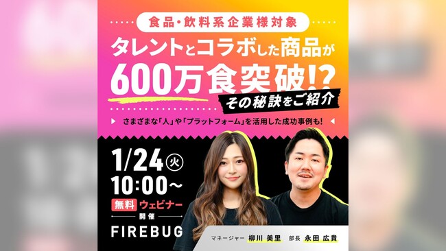 タレントエンパワーメントパートナーとして多様なコンテンツを中心にマーケティングソリューションを提供する株式会社FIREBUG(本社:東京都渋谷区、代表取締役 CEO:佐藤詳悟、代表取締役 CIO/CFO:宮崎聡、以下当社)は、1月24日(火)10:00より食品・飲料系企業様対象に、タレントを活用したマーケティング成功事例をご紹介する無料ウェビナーを開催します。