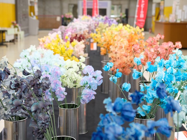 スイートピーには存在しない色合いの青系や黒・グレー、ブラウン、黄色やオレンジなど、モノトーンに近いシックなものからカラフルでポップな色合いまでトレンドの色を具現化したような品揃えで、花のプロたちも興味深そうにチェックしていました。