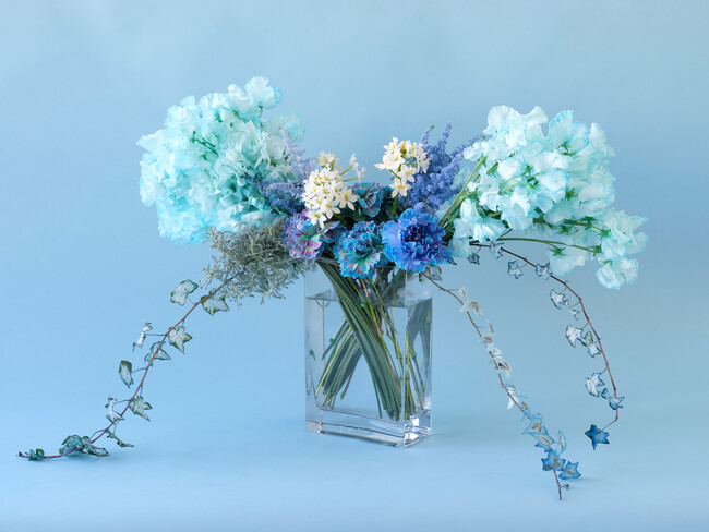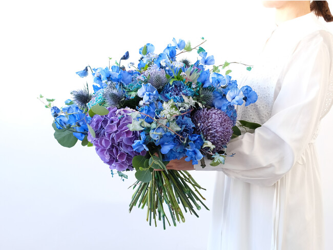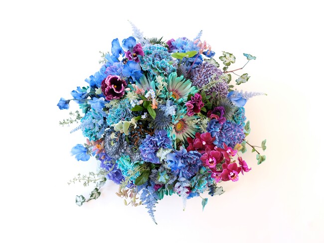 港町横浜の風景をブルーのグラデーションで表現しました。自然界の花色で青は希少ですが、染め花ならではのラインナップを活かした鮮やかな発色の美しい色合わせです。