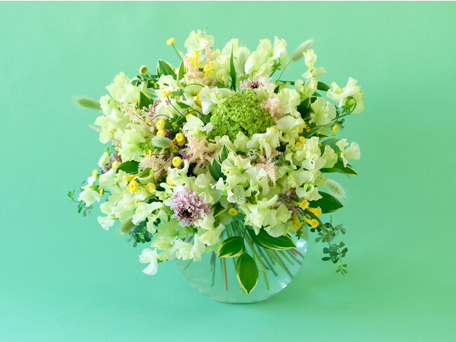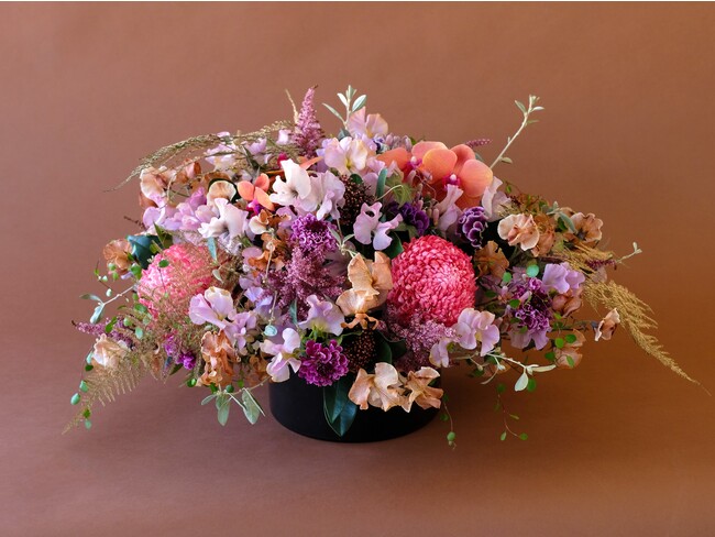 映画・演劇の街として煌びやかなイメージを持つ日比谷を自然の植物には存在しない特別な色「ゴールド」に染色したアスパラガスで表現。ブラウンやパープルなど濃厚な色合わせで、ラグジュアリーでリュクスな印象に。