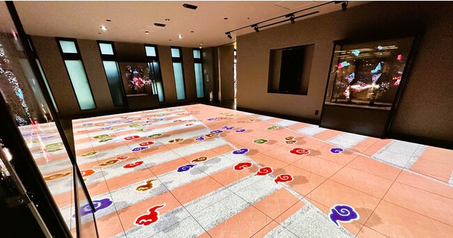本コンテンツでは、首里城の建造物に描かれた柄や模様、琉球の伝統衣装の模様などをモチーフにした映像が、赤外線センサーを活用したセンシング技術によって人の動きに合わせて変化し、幻想的な空間を作り出します。