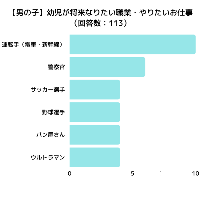 男の子の回答内容は1位が「運転手(電車・新幹線)」、2位が「警察官」、3位は「サッカー選手」、「野球選手」、「パン屋さん」、「ウルトラマン」という結果になりました。