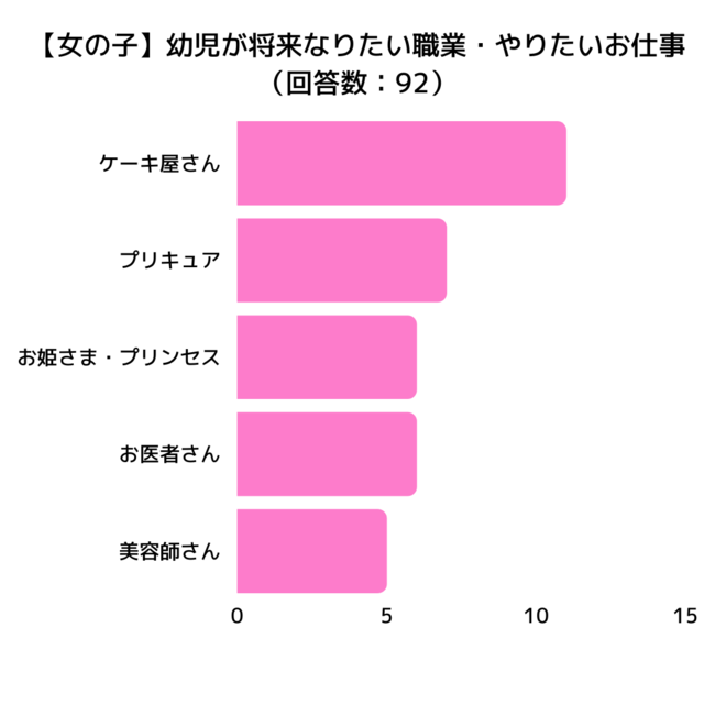 女の子の回答内容は1位が「ケーキ屋さん」、2位が「プリキュア」、3位は「お姫さま・プリンセス」、「お医者さん」、5位が「美容師さん」という結果になりました。