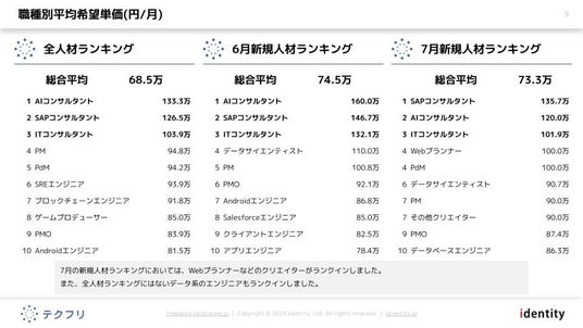 ITフリーランスエンジニアの案件・求人サイト「テクフリ」(https://freelance.techcareer.jp/)を運営する株式会社アイデンティティー(東京都新宿区、代表取締役:今野 力、以下「当社」)は、テクフリのデータベースをもとに2024年7月における人材の市況感を調査しました。より詳しい結果については、お問い合わせから資料請求が可能です。