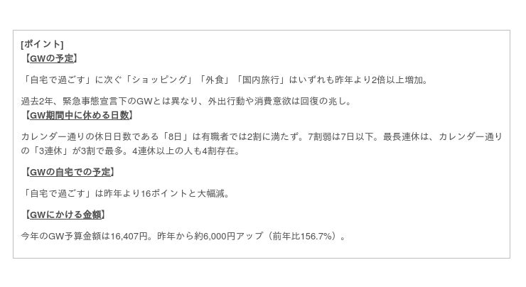 株式会社インテージ(本社:東京都千代田区、代表取締役社長:檜垣 歩、以下インテージ)は、ゴールデンウイーク(GW)について、全国の15歳から79歳の男女を対象に2022年4月4日~4月6日に実施した調査結果を公開します。