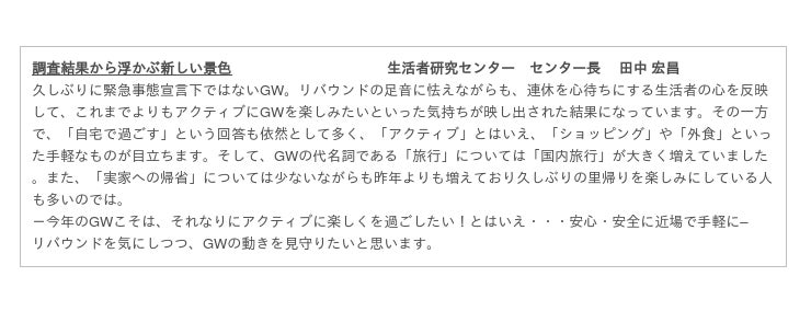 現在、一部の地域によってはリバウンドの兆しらしき動きもありますが、今年こそは少しでも家族や友人とのリアルな交流が実現できるGWになることを期待したいと思います。