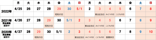 〈参考〉ゴールデンウィークカレンダー 2020~2022年