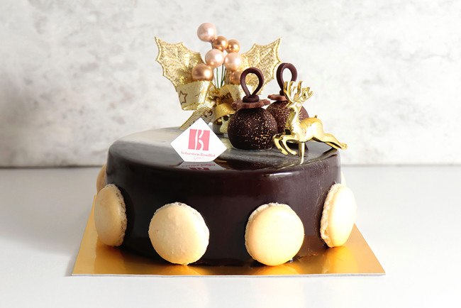 艶やかなグラサージュの周りにマカロン生地やチョコのクリスマスボールを施した、遊び心溢れる仕上がりです。