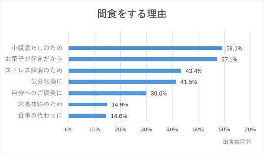 Topics1.:間食をする理由の上位は「小腹満たし」「お菓子が好き」「ストレス解消」。一方で「食事の代わりに」「栄養補給のために」と答える人も。