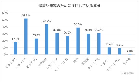 間食やおやつの購入で、健康や美容を気にする層が一定数おり、栄養成分も気にされる傾向があることが上記で分かりました。実際に健康や美容のために注目している成分は1位「ビタミンC」で半数以上の人が回答しています。続いて、「食物繊維」「鉄分」に注目が集まっているという結果になりました。