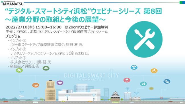 第8回は「産業分野」がテーマです。ウェビナーでは、浜松市スタートアップ戦略推進協議会の吹野豪氏、デジタルワークシフトコンソーシアム浜松の沢渡あまね氏、株式会社サカエの川島健氏をお招きしご講演をいただきます。また、「産業分野の取組と今後の展望」をテーマに、座談会や質疑応答を実施します。