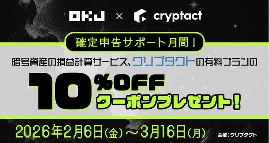 OKJでは確定申告シーズンに向けて、暗号資産の自動損益計算サービス「クリプタクト」を提供する株式会社pafin様と、ユーザーの皆様の確定申告をサポートするキャンペーン「確定申告サポート月間!」を開催いたします。