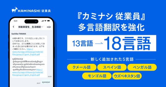 現場DXプラットフォーム『カミナシ』シリーズを提供する株式会社カミナシ(本社:東京都千代田区、代表取締役:諸岡 裕人、以下「カミナシ」)は、現場従業員管理システム『カミナシ 従業員』の自動翻訳機能の対応言語を18言語へ拡大したことをお知らせいたします。今回の対応言語拡大によって、より多様な国籍・言語を使用する外国人従業員との円滑なコミュニケーションが可能となります。