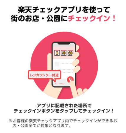 「楽天チェック」は、対象の店舗や施設へチェックイン(アプリで来店・来館を検知)するだけで「楽天ポイント」を貯めたり、お得なクーポンを獲得することができるサービスです。アプリ内に表示されている店舗や施設内の指定エリアで「楽天チェックアプリ」のチェックインボタンをタップすることでサービスを利用できます。貯まった「楽天ポイント」は、「楽天ペイ(アプリ決済)」加盟店をはじめ、「楽天ポイントカード」加盟店、楽天グループの各サービスでも利用できます。