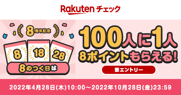 楽天ペイメント株式会社(本社:東京都港区、代表取締役社長:中村 晃一、以下 楽天ペイメント)が運営するポイ活サービス「楽天チェック」は、2022年4月にサービス開始8周年を迎えました。このたび、8周年を記念して、「8周年記念!8のつく日は100人に1人8ポイントもらえるキャンペーン」を、4月28日(木)から10月28日(金)まで実施します。