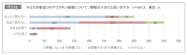 「子どもにワクチンを接種する・多分接種する」保護者でも、情報が十分だと「とても思う」「まあまあ思う」のは0.9%、「子どもにワクチン接種をしない・多分接種しない」保護者では、「とても思う」「まあまあ思う」のは0.7%という結果になりました(グラフ1)。