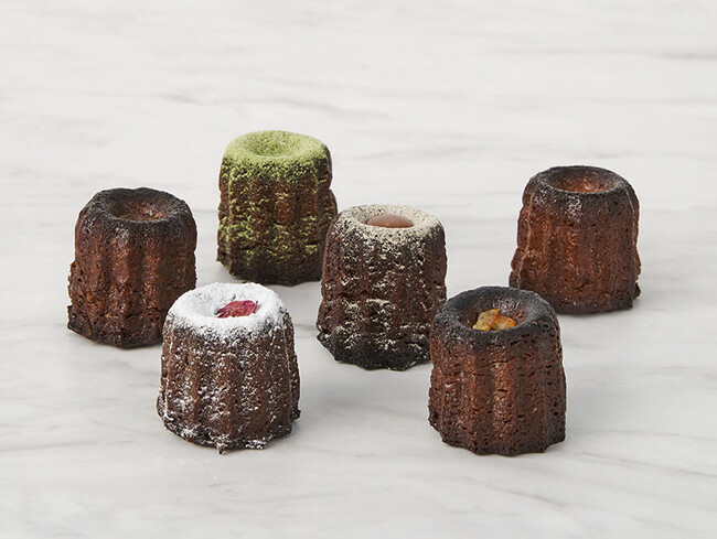 他にも焦がし塩キャラメルをトッピングした「ほうじ茶カヌレ」やローズの花びらをトッピングした「ジャスミン茶カヌレ」、オレンジピールをトッピングしたスパイス香る「チャイカヌレ」など、全6種類をスタイリッシュな缶に入れてお届けします。