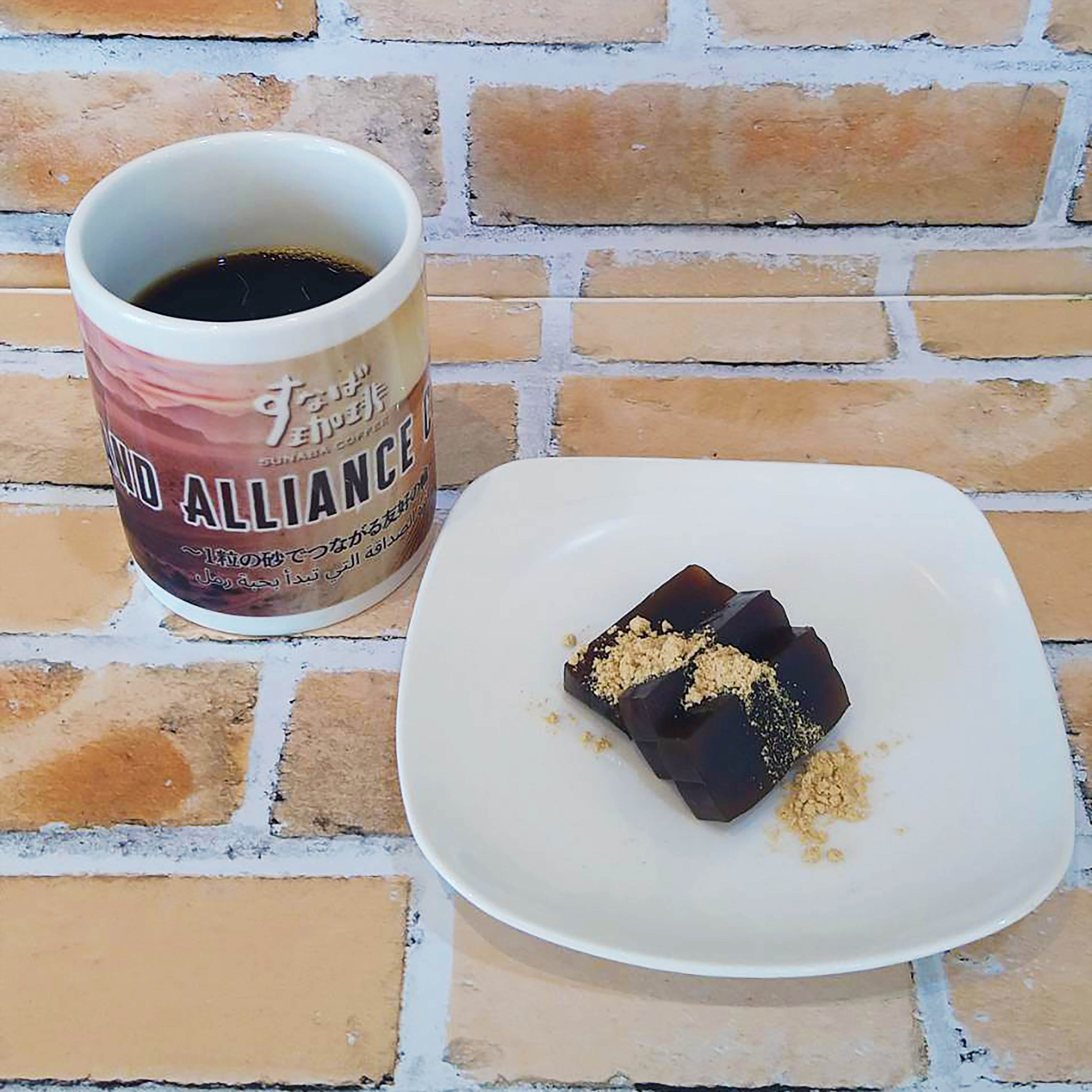 ■サンドアライアンスコーヒーと羊羹セット(800円 税込)鳥取砂丘の砂とヨルダンの赤い砂、それぞれの「砂焼きコーヒー」の豆を絶妙な割合でブレンドした「サンドアライアンスコーヒー」。コーヒーはホットまたはアイスをお選びいただけます。