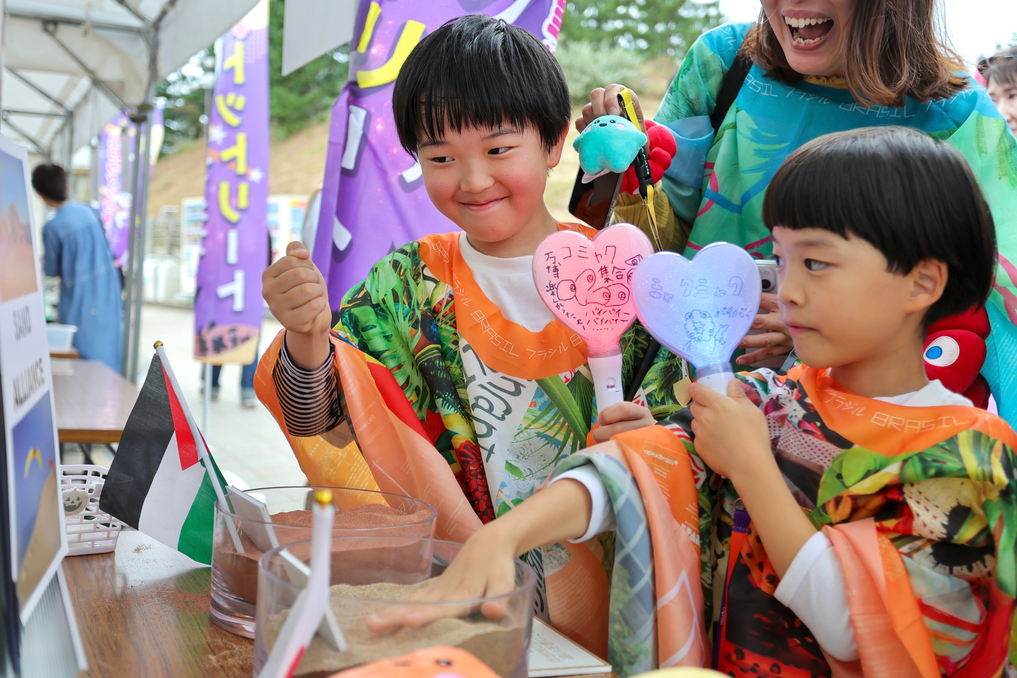 また特設テントでは、万博で話題となった砂の友好同盟「サンド・アライアンス」を締結したヨルダンのワディラムの赤い砂と鳥取砂丘の砂を展示。来場者は砂を触り比べながら色や砂の大きさなどの違いを楽しみました。またご当地コーヒーチェーン「すなば珈琲」が開発したヨルダンの赤い砂と鳥取砂丘の砂で焙煎した「SAND ALLIANCE COFFEE」と珈琲を練りこんだ羊羹の提供も行われ、来場者は焙煎方法などを興味深そうに聞きながら、万博によって生まれた特別な珈琲の味を楽しみました。