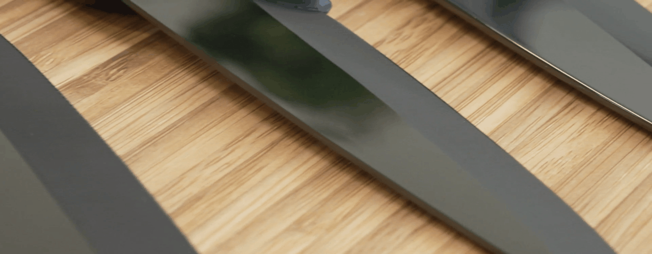 「熱間静水圧プレス加工」ではなく、手間隙のかかる「冷間等方圧加圧法」で作られた、均一でムラのない高密度な刃体が特長です。表面の仕上がりが良く、鏡のように映すことができる優雅な刃体が完成しました。