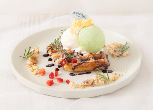 クリームチーズアイスとピスタチオアイスをのせたクロッフル。