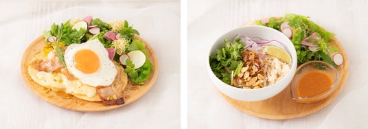 【WOOZI】 メープルベーコンエッグパンケーキ、【THE 8】 担々ベースのフォー