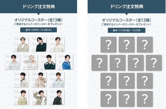 CAFEでドリンクメニューをご注文された方にご注文メンバーの「オリジナルコースター(全13種)」を1品につき1枚プレゼント。