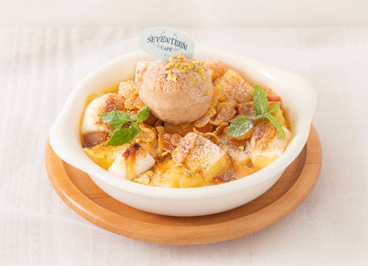 ミルクティーアイスをのせたりんごとシナモンのパンプディング。