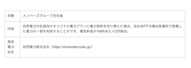 株式会社メンバーズ(本社:東京都中央区、代表取締役社長:剣持 忠、以下「メンバーズ」)は、自社の非FIT太陽光発電所で発電する再生可能エネルギーを使用した社員向けオリジナル電力プランを、自然エネルギー発電事業のリーディングカンパニーである自然電力株式会社(本社:福岡県福岡市、代表取締役:磯野 謙、川戸 健司、長谷川 雅也、以下「自然電力」)と共同開発し、メンバーズグループ社員に向けて提供を開始することになりましたので、お知らせいたします。