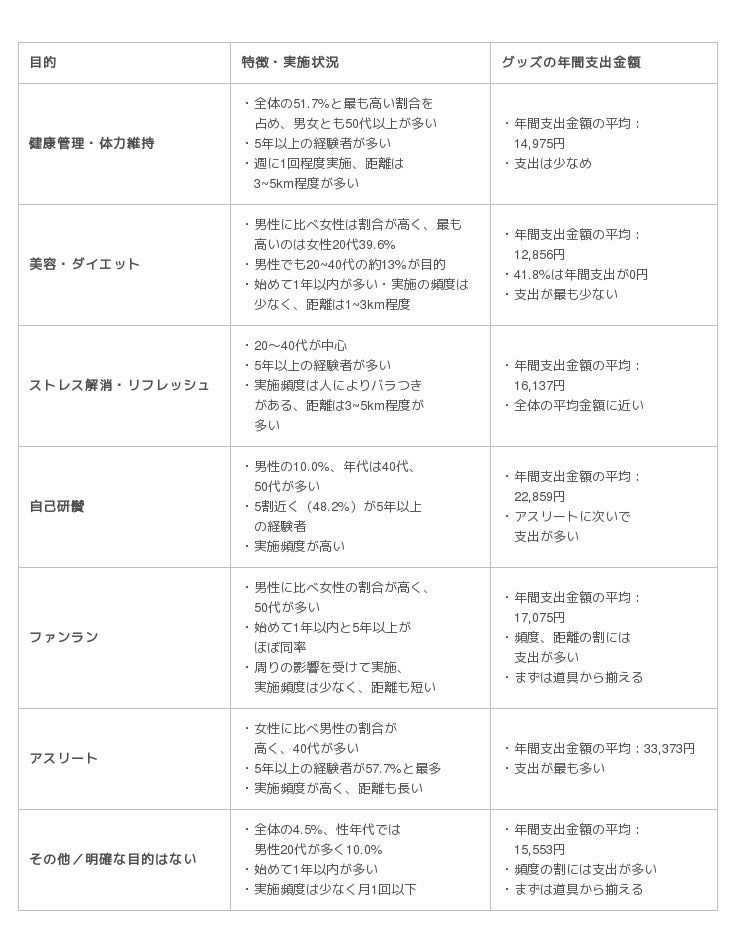 ジョギング・ランニングを行う主な目的を聴取し、目的別で分類したところ7つのタイプに分けられた。各目的別に、実施状況・グッズの年間支出金額を分析した結果、以下のことが分かった。