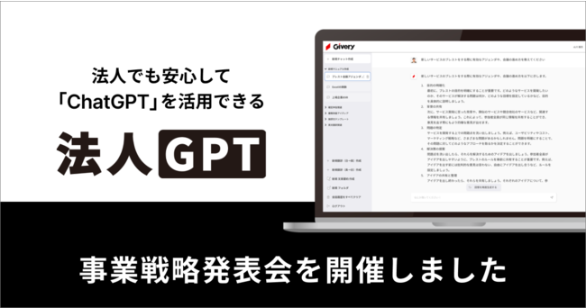 AIチャットボット、AI-FAQなどの業務自動化ソリューションを提供する株式会社ギブリー(本社:東京都渋谷区、代表取締役:井手 高志、以下ギブリー)は、ChatGPT法人向けプラットフォーム「法人GPT」の提供開始に伴う事業戦略発表会を4月4日(火)に開催しました。