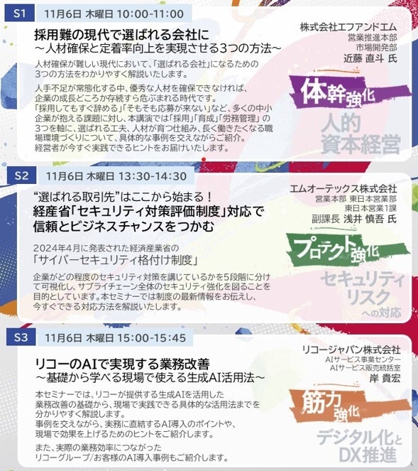 セミナーには、各分野に精通したプロフェッショナルが登壇し、人材確保、セキュリティ、AI活用などの最新事例や、実践的なノウハウをご紹介します。