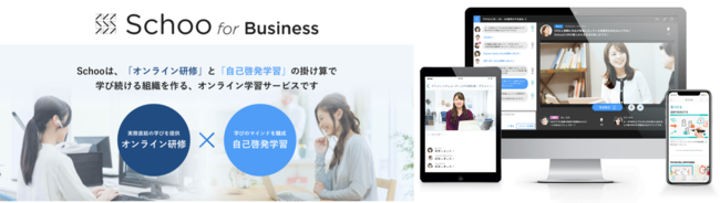 「今学びたい学習コンテンツに出会える」をコアバリューとし、社会人向け学習動画を約6,800本提供。ビジネスマナーやスキル、営業・プログラミング・デザインの実務スキルについてオンライン動画にて持続的な学習環境を提供することで導入企業は累計2,400社を突破。学習動画を元にした研修カリキュラムの提供やレポート提出、利用者の学習時間・学習傾向から興味のある分野を分析可能。オンライン集合学習機能も搭載。自発型学習による社員一人ひとりの潜在した可能性との出逢い、成長の機会の提供に役立てられている。オンライン学習サービス調査で4部門1位を獲得(http://corp.schoo.jp/2021/02/0218_press/)。