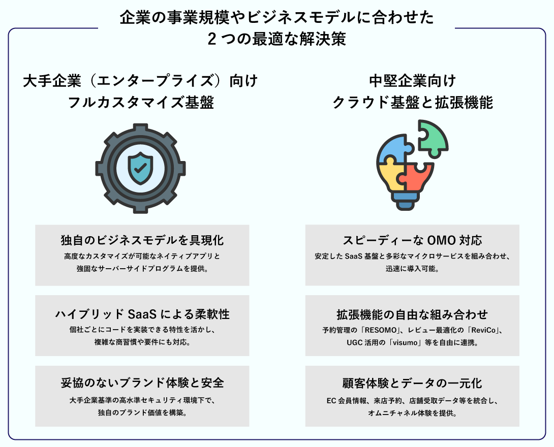 あらゆる規模の企業が、自社のビジネスモデルに最適な形でリアル(実店舗)とデジタルを融合できるよう、以下の2つの解決策を提供します。