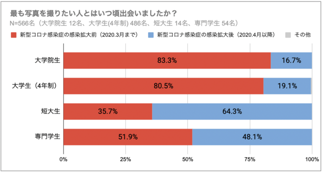 「友達」と撮りたいニーズが多い中で、「その人とはいつ出会ったか」を尋ねると、大学院・大学生はコロナ前が8割以上なのに対し、2年制が多い短大生や専門学生は「コロナ以後」の割合が高くなっています。