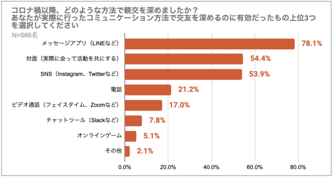 さらに、写真を一緒に撮りたい相手と、コロナ禍以降、親交を深めるのに有効だった手段を尋ねると、第1位はメッセージアプリ(78.1%)で、様々なオンラインコミュニケーション方法がある中で第2位に挙がったのは、実際に会って行動をともにする「対面」(54.4%)でした。