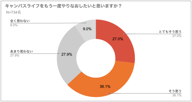 2022年春に大学院・大学・短大・専門学校のいずれかを卒業予定の学生男女734名(男性356名、女性378名/大学院生17名、大学生620名、短大生18名、専門学生79名)に、キャンパスライフについて尋ねると、「やり直したいと思う」と回答した人は63.1%に登りました。